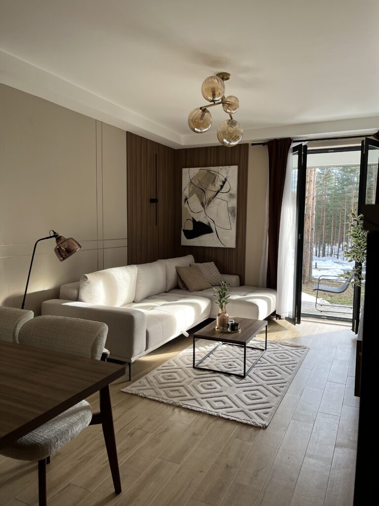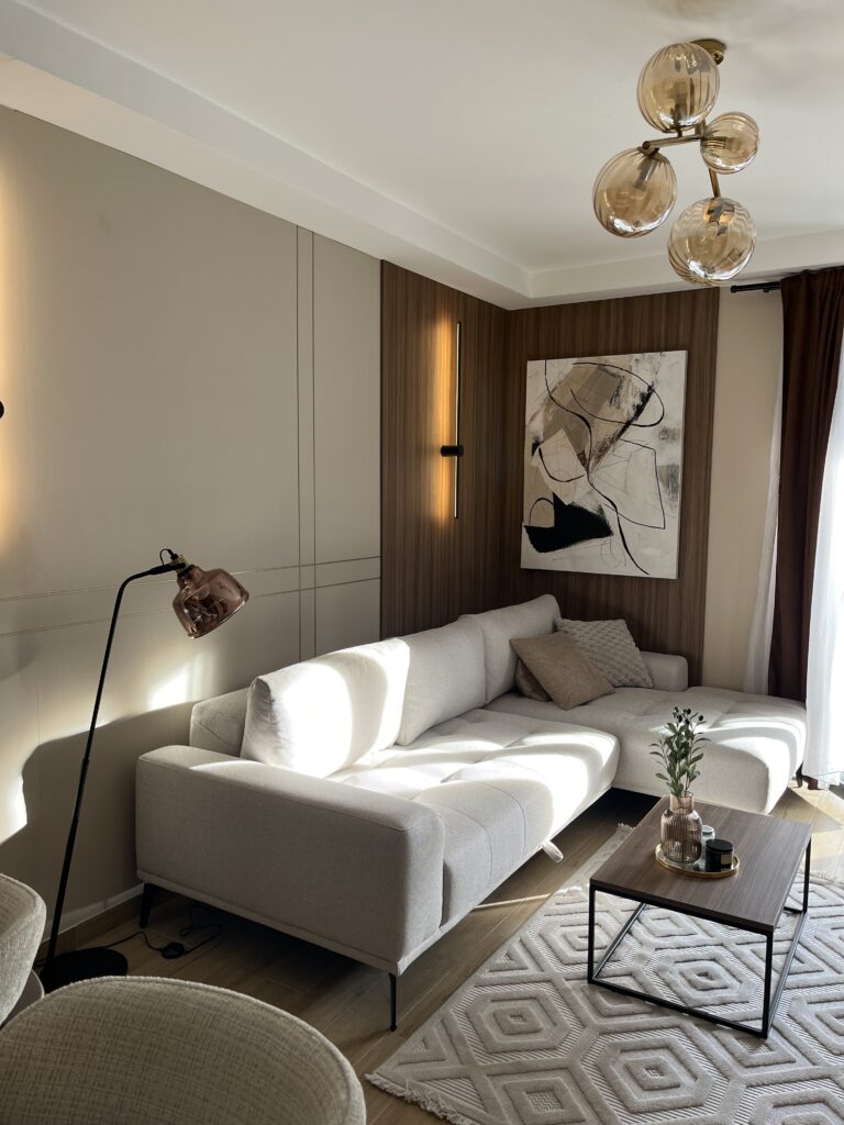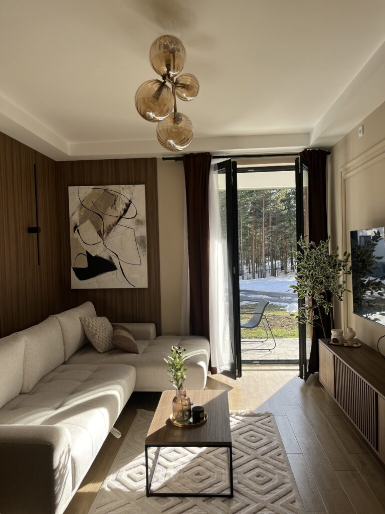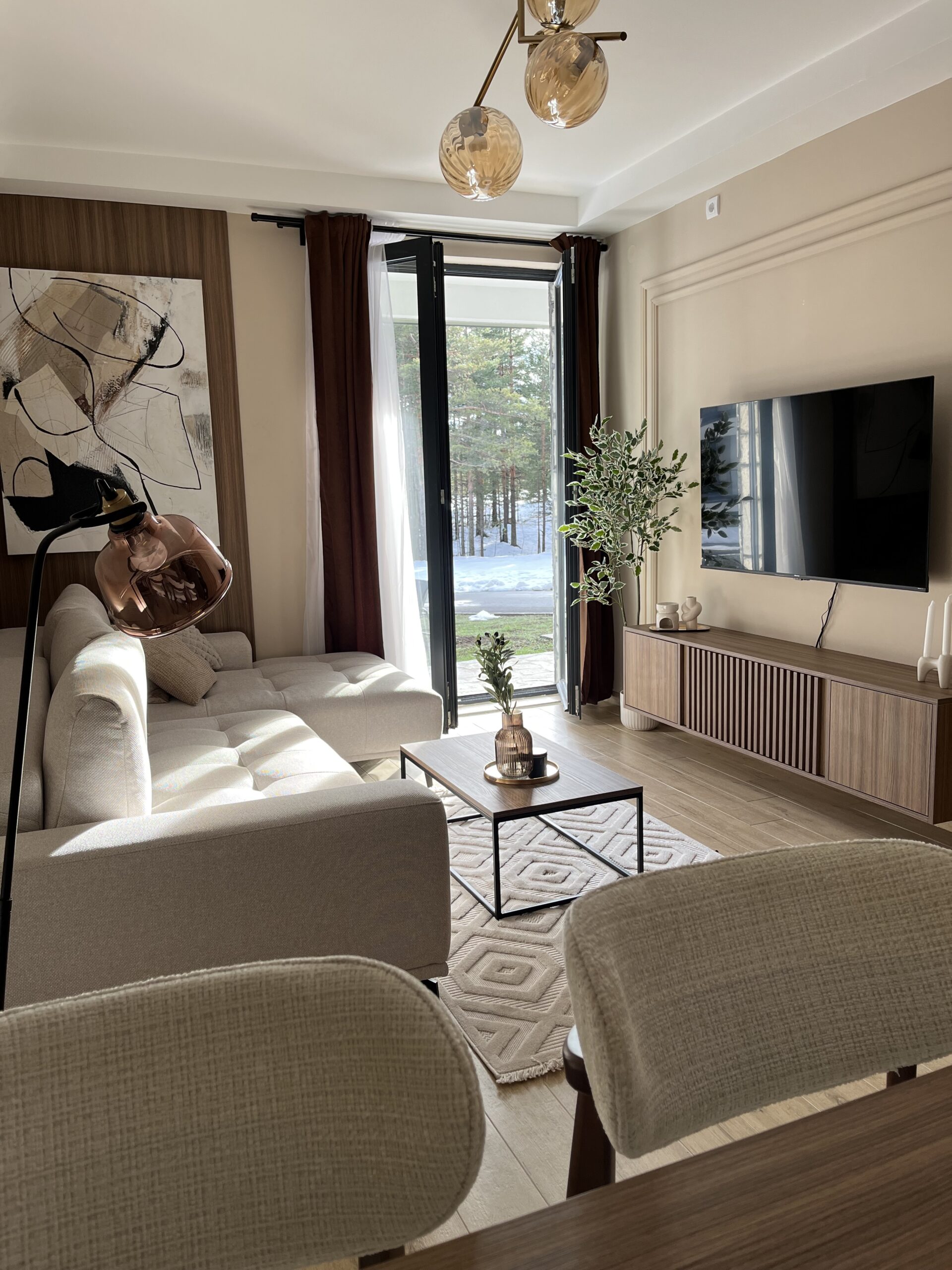 Apartman ima odvojenu spavaću sobu sa bračnim krevetom 160x200cm, a u dnevnom boravku ugaonu garnituru na razvlačenje.