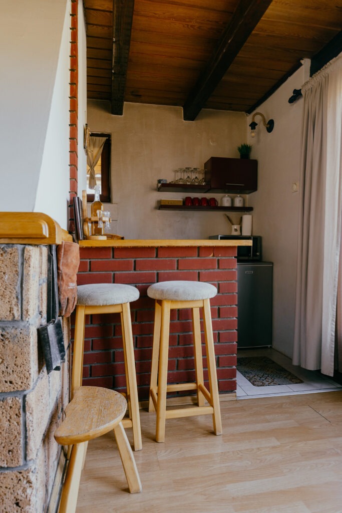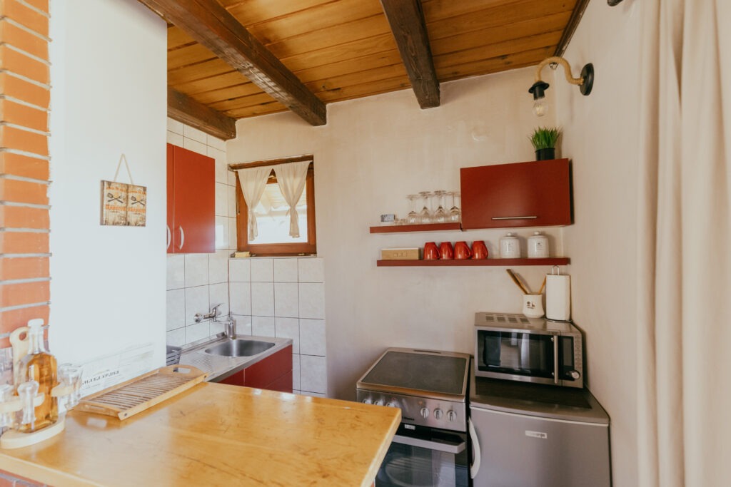 Prizemlje kolibe raspolaže sa dnevnim boravkom, kupatilom, komplet opremljenom kuhinjom, trpezarijom, zatvorenom verandom i terasom. U potkrovlju se nalazi velika soba sa dva kreveta i jednim francuskim ležajem.