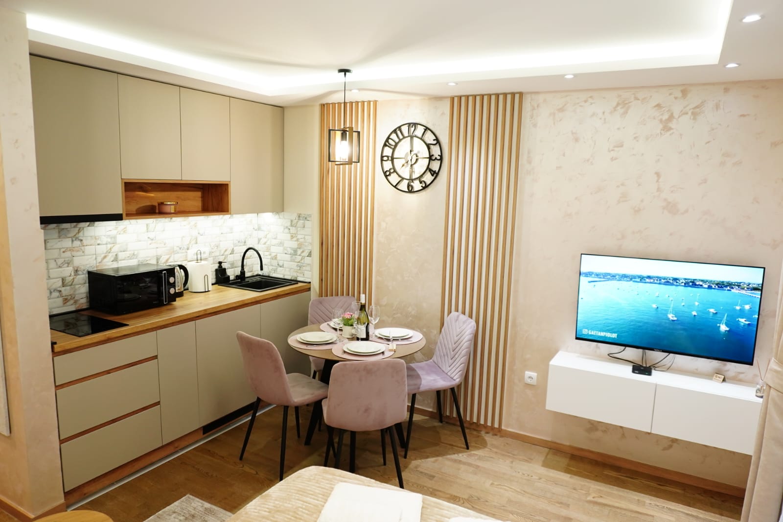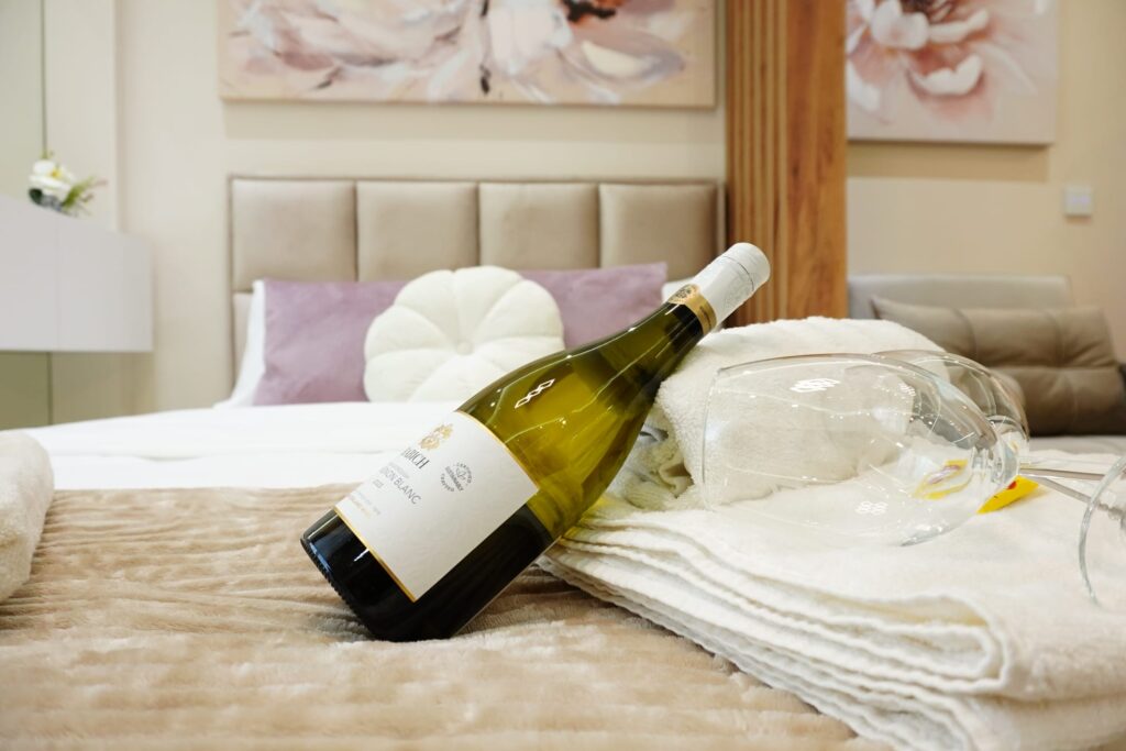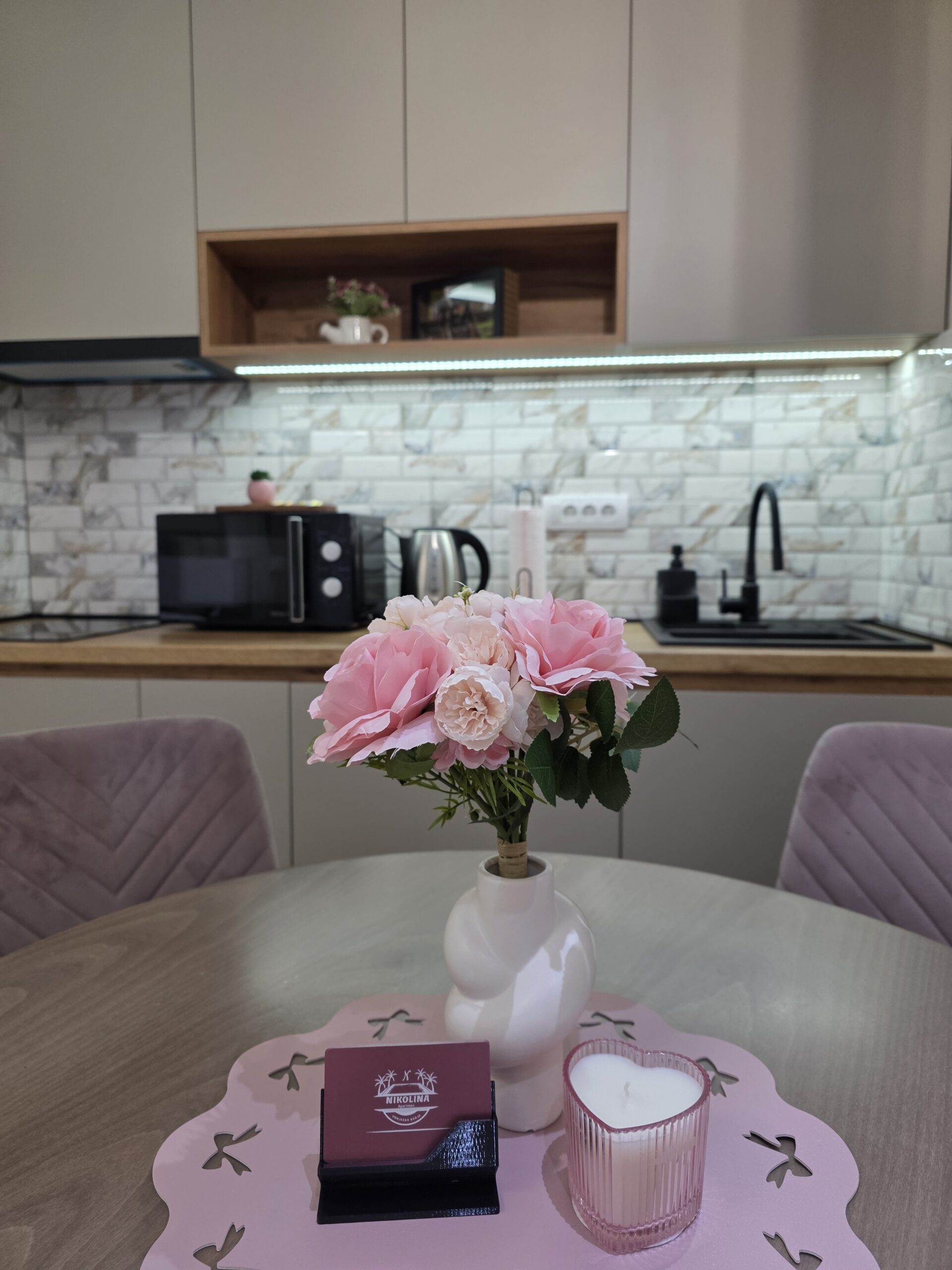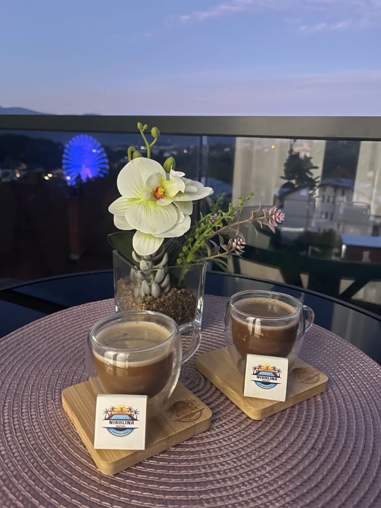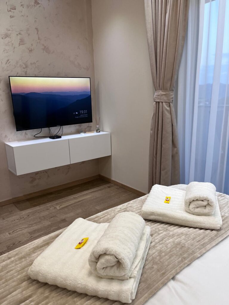 U apartmanu gostima je na raspolaganju potpuno opremljena kuhinja, kao i posteljina, peškiri, kupatilo sa svim neophodnim toaletnim priborom, ali i terasa sa panoramskim pogledom na grad.